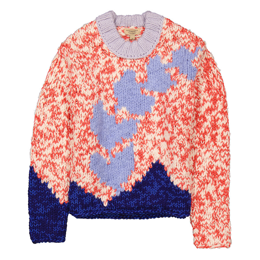 Burberry Ladies Tops. Fashion category: Cardigans & Sweaters. SKU: 8001834. Color: Bright Red. Burberry Crewneck Knit Jumper in Bright Red. Crafted from a wool belnd and features contrast knit design, a crew neck, long sleeves and a chunky knit. material: Polyester 53%, Wool 47%. GENERAL Color: Bright Red INFORMATION Brand: Burberry Gender: Womens Model: 8001834 DETAILS Category: Tops Apparel Type: Cardigans & Sweaters Material: Polyester, Wool ADDITIONAL INFO Jomashop Sku: -8001834N Department: Apparel