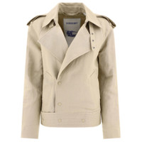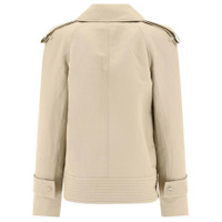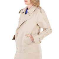 Burberry Ladies Outerwear. Fashion category: Coats & Jackets. SKU: 8087349. Material: Viscose. Color: Oat. Burberry Double-Breasted Canvas Trench Jacket. This jacket features a canvas material, shoulder boards, wide falling lapels, an asymmetrical button closure at the front, deep shoulders, long sleeves with straps, two side pockets, and a straight hem. Outer: 68% paper fibre, 32% viscose, Lining: 100% viscose. Made in Poland. GENERAL Color: Oat INFORMATION Brand: Burberry Gender: Womens Model: 8087349 DETAILS Category: Outerwear Apparel Type: Coats & Jackets Material: Viscose ADDITIONAL INFO Jomashop Sku: -8087349N Department: Clothing