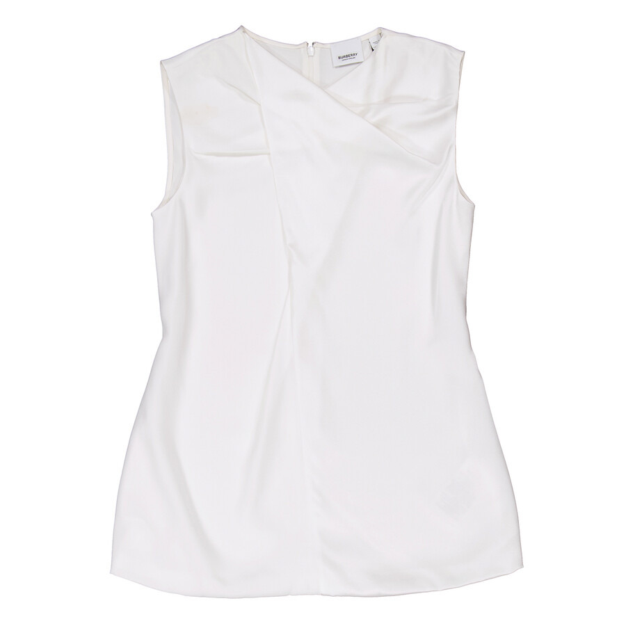 Burberry Ladies Tops. SKU: 8071271. Color: Natural White. Burberry Ladies Natural White Greta Draped Satin-Back Crepe Top. This crepe top boasts a concealed back hook-and-eye and zip closure, sleeveless design, and a draped front panel to emphasise the contrasting textures. 60% acetate, 40% viscose. Binding: 100% silk. Made in Italy. GENERAL Color: Natural White INFORMATION Brand: Burberry Gender: Womens Model: 8071271 DETAILS Category: Tops Apparel Type: Shirts & Blouses ADDITIONAL INFO Jomashop Sku: -8071271N Department: Clothing