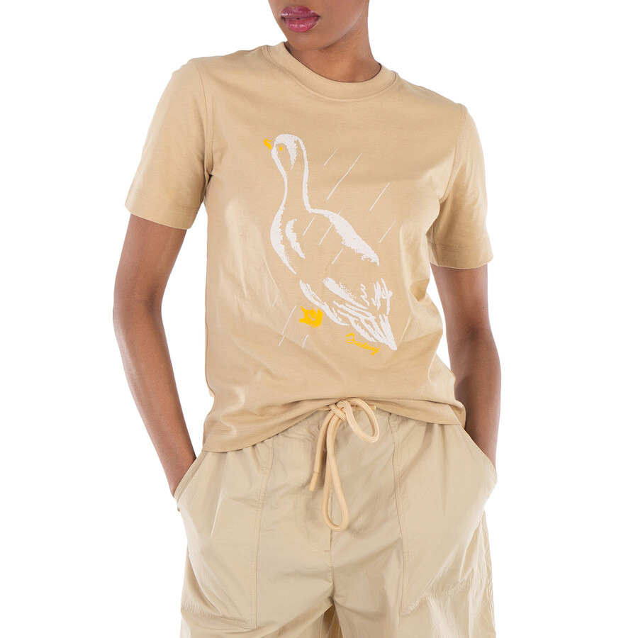 Burberry Ladies Tops. Fashion category: T-Shirts & Henleys. SKU: 8093586. Material: Cotton. Color: Flax. Burberry Duck Printed Crewneck Cotton T-Shirt. This t-shirt is made from 100% cotton, featuring a lightweight jersey fabric, a logo print on the front, a flocked duck motif, a crew neck, short sleeves, and a straight hem. 100% cotton. Made in Italy. GENERAL Color: Flax INFORMATION Brand: Burberry Gender: Womens Model: 8093586 DETAILS Category: Tops Apparel Type: T-Shirts & Henleys Material: Cotton ADDITIONAL INFO Jomashop Sku: -8093586N Department: Clothing