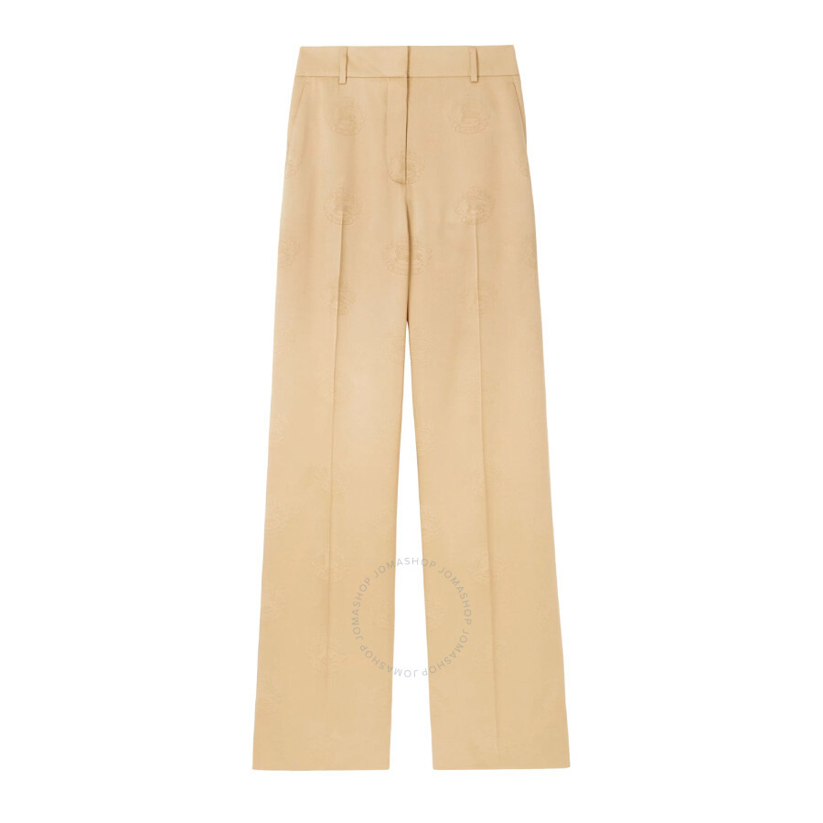 Burberry Ladies Bottoms. Fashion category: Pants & Leggings. SKU: 8072531. Color: Soft Fawn Ip Pttn. Burberry EKD Wide-Leg Silk Trousers. A pair of high-waisted, wide-leg silk trousers adorned with an all-over EKD logo print. Designed with belt loops, a concealed front fastening, and sharp pressed creases, they fall to a straight hem for a refined, tailored finish. Silk 100% Made in Italy. GENERAL Brand Type: Designer Color: Soft Fawn Ip Pttn INFORMATION Brand: Burberry Gender: Womens Model: 8072531 DETAILS Category: Bottoms Apparel Type: Pants & Leggings Material: Silk ADDITIONAL INFO Jomashop Sku: -8072531N Department: Clothing