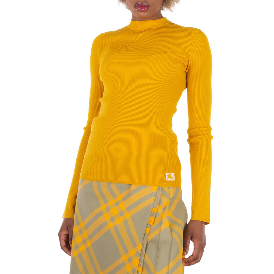 Burberry Ladies Tops. Fashion category: Cardigans & Sweaters. SKU: 8077681. Color: Pear. Burberry EKD Wool Blend Top. Crafted from a wool blend, this jumper features a ribbed knit design, the signature Equestrian Knight motif, a classic crew neck, long sleeves, and a straight hem for a timeless and refined look. Wool 89%, Polyester 11% Made in Italy. GENERAL Brand Type: Designer Color: Pear INFORMATION Brand: Burberry Gender: Womens Model: 8077681 DETAILS Category: Tops Apparel Type: Cardigans & Sweaters Material: Polyester, Wool ADDITIONAL INFO Jomashop Sku: -8077681N Department: Clothing