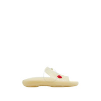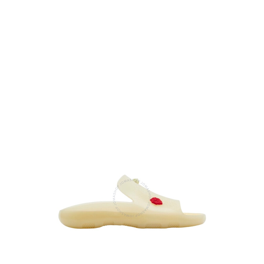 Burberry Ladies Sandals. SKU: 8081777. Color: Marshmallow. Burberry Embellished Logo Slides. This slides features a slip-on style, a single toe strap, a signature Equestrian Knight motif, an open toe and a flat rubber sole. Upper: 100% rubber Lining: 60% EVA, 40% rubber Sole: 100% rubber. Made in Italy. Please visit the brand website for sizing information. INFORMATION Brand: Burberry Model: 8081777 Gender: Womens DETAILS Category: Sandals Color: Marshmallow Upper Material: Rubber Lining Material: Rubber Sole Material: Rubber ADDITIONAL INFO Jomashop Sku: -8081777N Department: Shoes