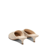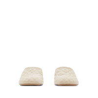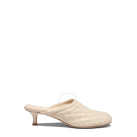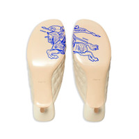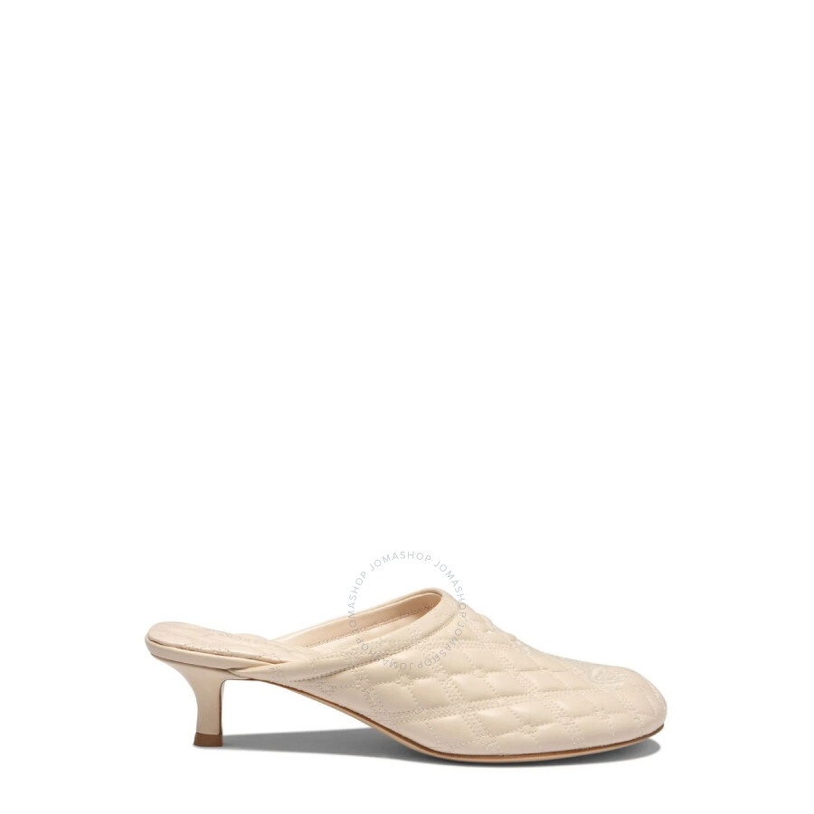 Brand: Burberry. SKU: 8085640. Color: Soap. Burberry Embroidered Quilted Mules. Crafted from lambskin and sheepskin, this pair of mules features a quilted design with an embroidered logo. They have a round toe, a slip-on style, and are set on a 45mm kitten heel for a chic and comfortable look. Lambskin 75%, Polyester 25% Made in Italy. Please visit the brand website for sizing information. INFORMATION Brand: Burberry Model: 8085640 Gender: Womens DETAILS Category: Heels Shoe Style: Mules Shoe Style: Mules Color: Soap Shoe Vamp Style: Slip-on Sole Material: Leather ADDITIONAL INFO Jomashop Sku: -8085640N Department: Shoes
