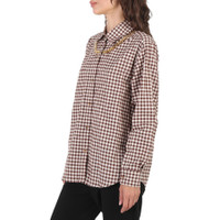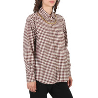 Burberry Ladies Tops. SKU: 4562578. Color: Brown Pttn. Burberry Gingham Cotton Check Chain Detail Shirt. This cotton-flannel shirt features a front button-down placket, long sleeves, point collar, double chest pockets, curved hem and a gold-tone metal curb-chain trim. Material: 100% cotton. GENERAL Color: Brown Pttn INFORMATION Brand: Burberry Gender: Womens Model: 4562578 DETAILS Category: Tops Apparel Type: Casual Button-Downs ADDITIONAL INFO Jomashop Sku: -4562578N Department: Apparel