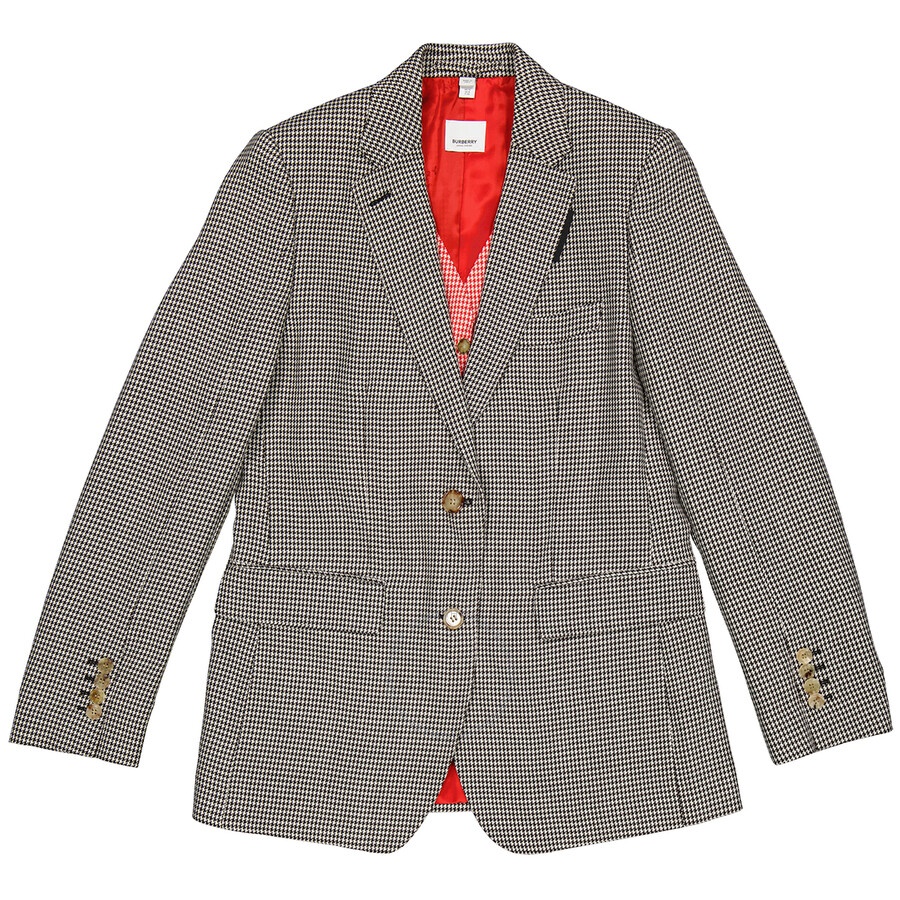 Burberry Ladies Outerwear. Fashion category: Coats & Jackets. SKU: 4562621. Color: Bright Red. Burberry Houndstooth Check Wool Blazer With Waistcoat Detail. This tailored jacket blazer from Burberry in houndstooth check wool, featuring a single-breasted button closure, long sleeves, rear central vent, reconstructed cuffs, chest welt pocket, two front pockets and a contrasting press-stud waistcoat panel. Outer: 100% wool. Lining: 100% cupro. Made in Italy. GENERAL Color: Bright Red INFORMATION Brand: Burberry Gender: Womens Model: 4562621 DETAILS Category: Outerwear Apparel Type: Coats & Jackets ADDITIONAL INFO Jomashop Sku: -4562621N Department: Apparel