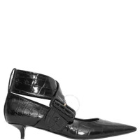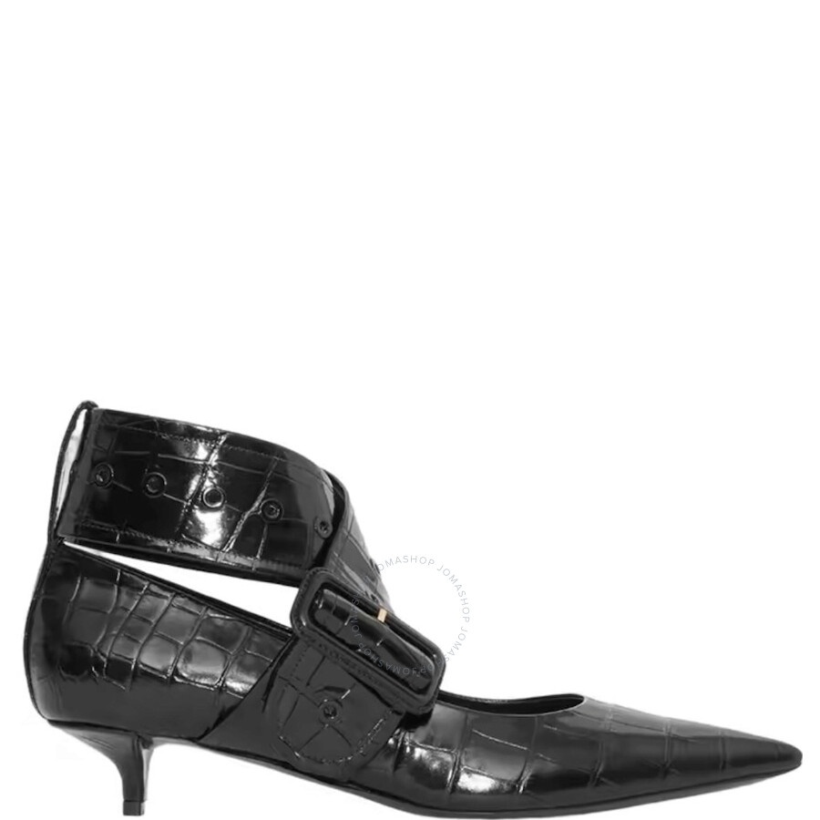 Burberry Ladies Heels. SKU: 8060140. Color: Black. Shoe Style: Ankle Strap. Vamp Style: Slip-on. Upper Material: Leather. Lining Material: Leather. SoleMaterial: Leather. Burberry Kitten-Heel Point-Toe Embossed Leather Pumps. These kitten-heel leather pumps are crafted in jet black with an embossed crocodile effect. They feature a pointed toe, side buckle fastening, branded leather insole, and a chic kitten heel. 100% Leather.Please visit the brand website for sizing information. INFORMATION Brand: Burberry Model: 8060140 Gender: Womens DETAILS Category: Heels Color: Black ADDITIONAL INFO Jomashop Sku: -8060140N Department: Shoes