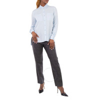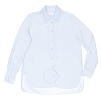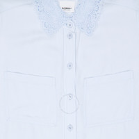 Burberry Ladies Tops. Fashion category: Shirts & Blouses. SKU: 8067789. Color: Glacier Blue. Burberry Ladies Lace Collar Ste-Hem Button-Up Shirt. This shirt is cut in an oversized silhouette and features an intricate lace shirt collar and a mother-of-pearl button front,sleeves with barrel button cuffs, chest patch pockets, and a split side design with a round high-low hem. 100% Viscose,100% Polyester. Made in Italy. GENERAL Brand Type: Designer Color: Glacier Blue INFORMATION Brand: Burberry Gender: Womens Model: 8067789 DETAILS Category: Tops Apparel Type: Shirts & Blouses ADDITIONAL INFO Jomashop Sku: -8067789N Department: Clothing