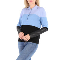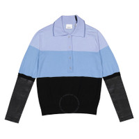 Burberry Ladies Tops. Fashion category: Shirts & Blouses. SKU: 4548471.Color: Blue. Burberry Ladies Blue Long Sleeve Polo Shirt. This polo shirt from Burberry features long sleeves panelled with supple lambskin, tipped collar, slip on and snap placket. Materials Lamb Skin 100%, Wool 100%. Made in Italy. GENERAL Color: Blue INFORMATION Brand: Burberry Gender: Womens Model: 4548471 DETAILS Category: Tops Apparel Type: Polo Shirts Material: Wool ADDITIONAL INFO Jomashop Sku: -4548471N Department: Apparel