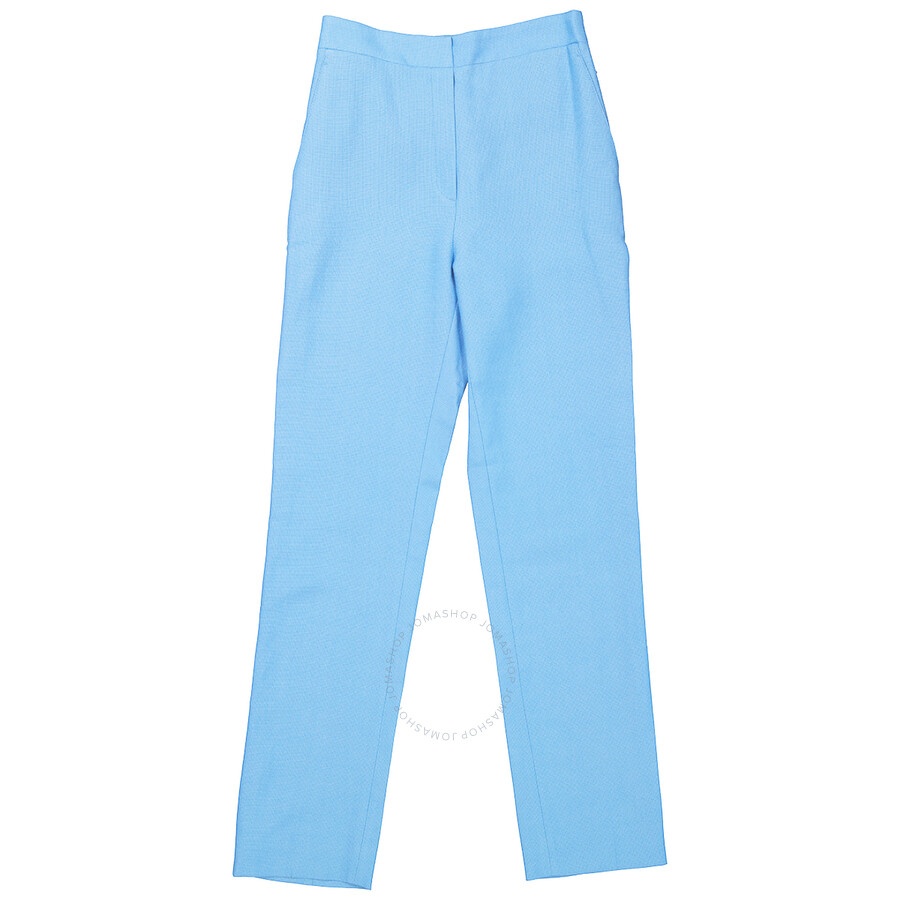 Burberry Ladies Bottoms. Fashion category: Pants & Leggings. SKU: 4566153. Color: Blue Topaz. Burberry Ladies Blue Topaz Jersey Sash Detail Tailored Trousers. Tailored from a blend of wool and ramie, featuring a high-waist, front pleated seams, straight leg and enhanced with a gathered jersey sash that flatteringly wraps adding tonal movement. 64% Wool, 36% Ramie. Made in Italy. GENERAL Color: Blue Topaz INFORMATION Brand: Burberry Gender: Womens Model: 4566153 DETAILS Category: Bottoms Apparel Type: Pants & Leggings ADDITIONAL INFO Jomashop Sku: -4566153N Department: Apparel