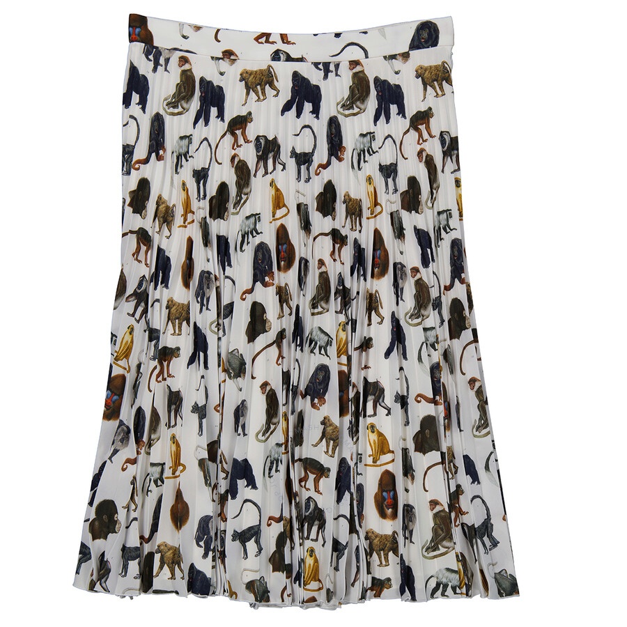Burberry Ladies Bottoms. Fashion category: Skirts. SKU: 8031262. Color: White Ip Pattern. Burberry Ladies Monkey Print Pleated Crepe De Chine Skirt. This Burberry skirt features a high waist, side zip fastening, knee-length and printed with antique monkey illustration motifs. 100% Polyester. GENERAL Color: White Ip Pattern INFORMATION Brand: Burberry Gender: Womens Model: 8031262 DETAILS Category: Bottoms Apparel Type: Skirts ADDITIONAL INFO Jomashop Sku: -8031262N Department: Apparel