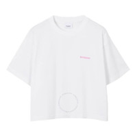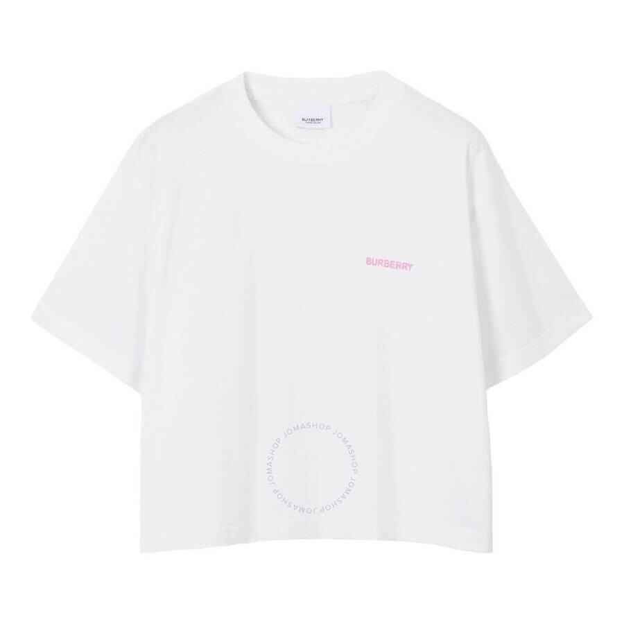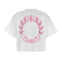Burberry Ladies Tops. Fashion category: T-Shirts & Henleys. SKU: 8073351. Burberry Laurel Oak Leaf Print T-Shirt.This cropped t-shirt features a logo print at the chest and rear, with a round neck, short sleeves, and a straight hem. Cotton 100%. Made in Italy. GENERAL Brand Type: Designer Color: White INFORMATION Brand: Burberry Gender: Womens Model: 8073351 DETAILS Category: Tops Apparel Type: T-Shirts & Henleys Material: Cotton ADDITIONAL INFO Jomashop Sku: -8073351N Department: Clothing
