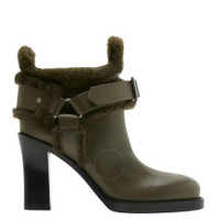 Burberry Ladies Boots. SKU: 8094966. Color: Loch. Burberry Leather-shearling Stirrup Boots. These Italian-made ankle boots are crafted from shearling and smooth calf leather, featuring B buckle straps inspired by equestrian styles. The design is set on a 100mm block heel and a leather sole embossed with the Equestrian Knight Design. Additional details include a rounded toe, quilted check insole, tonal stitching, silver-tone hardware, and a front buckle fastening. The boots are ankle-length and come with a branded insole and logo at the sole. Made in Italy. GENERAL Brand Type: Designer INFORMATION Brand: Burberry Model: 8094966 Gender: Womens DETAILS Category: Boots Shoe Style: Ankle boots Shoe Style: Ankle boots Color: Loch Shoe Vamp Style: Slip-on Upper Material: Calfskin Lining Material: Fur Sole Material: Leather ADDITIONAL INFO Jomashop Sku: -8094966N Department: Shoes