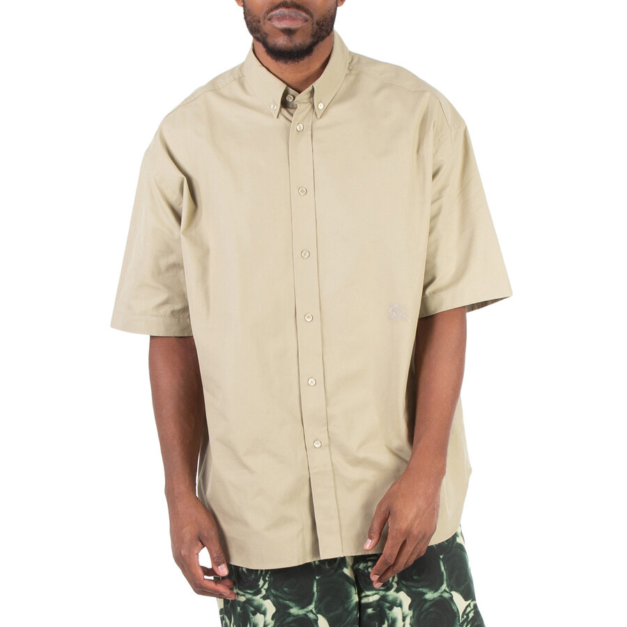 Burberry Men's Tops. Fashion category: Shirts & Blouses. SKU: 8081978. Burberry Logo-Embroidered Short Sleeve Poplin Shirt. This shirt features a poplin texture, an embroidered logo on the front, a spread collar with a button-down design, short sleeves, and a curved hem. 100% Cotton. Made in Italy. GENERAL Brand Type: Designer Color: Hunter INFORMATION Brand: Burberry Gender: Mens Model: 8081978 DETAILS Category: Tops Apparel Type: Shirts & Blouses Material: Cotton ADDITIONAL INFO Jomashop Sku: -8081978N Department: Clothing