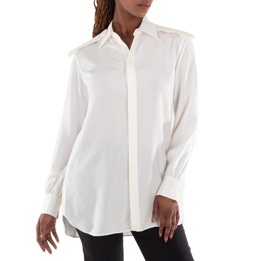Burberry Ladies Tops. Fashion category: Shirts & Blouses. SKU: 8087449. Material: Silk. Color: Grain. Burberry Long-Sleeved Classic Collar Silk Shirt. This silk shirt features a classic collar, concealed button closure at the front, shoulder boards, long sleeves with button cuffs, and a straight hem. 100% silk. Made in Italy. GENERAL Color: Grain INFORMATION Brand: Burberry Gender: Womens Model: 8087449 DETAILS Category: Tops Apparel Type: Shirts & Blouses Material: Silk ADDITIONAL INFO Jomashop Sku: -8087449N Department: Clothing
