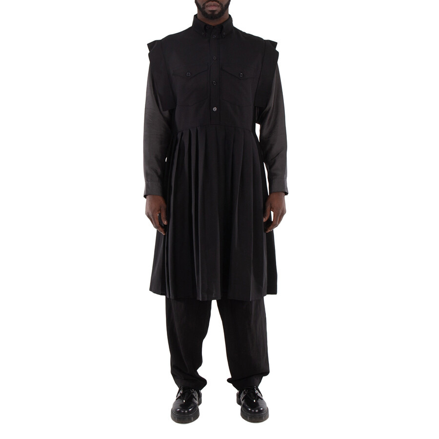 Burberry Men's Tops. SKU: 8045386. Color: Black. This mohair-blend dress captures a striking blend of historical inspiration and contemporary style. Its knife-sharp pleated skirt and winglike cap sleeves harken back to the garments worn by ancient soldiers under armor, evoking a sense of timeless strength and elegance. Classic tailored elements such as the button half-placket and button-down collar add a modern twist to its vintage-inspired design. Featuring chest button-flap patch pockets and partially lined for comfort, this dress is crafted in Italy from a luxurious blend of 59% mohair and 41% wool. It's a statement piece that seamlessly merges historical motifs with high fashion, showcasing exquisite craftsmanship and sophistication. 100% Cupro, 59% Mohair, 41% Wool. Made in Italy. GENERAL Color: Black INFORMATION Brand: Burberry Gender: Mens Model: 8045386 DETAILS Category: Tops ADDITIONAL INFO Jomashop Sku: -8045386N Department: Clothing