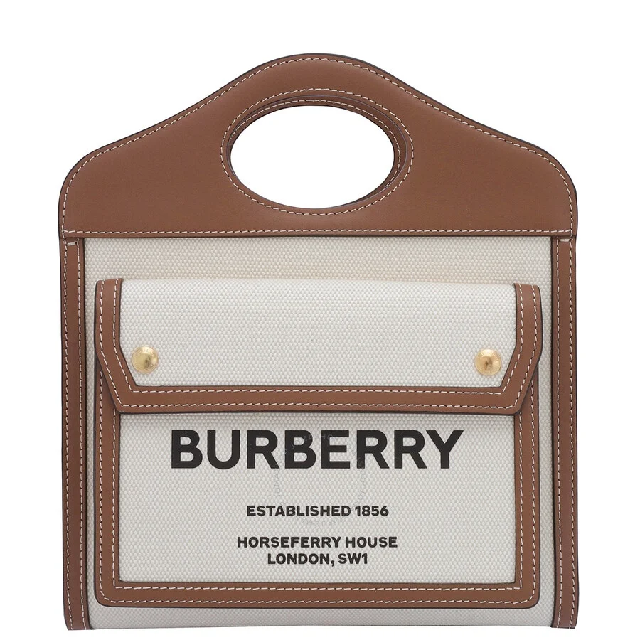 Burberry Ladies Tote. SKU: 8039361. Color: Natural/Malt Brown. Size: W 9.1" x H 10.4" x D 2.4". Burberry Natural / Malt Brown Mini Pocket Tote Bag. This mini Pocket tote features dual top handles, an exterior front flap pocket, a spasious interior compartment with a back zipped pocket, constrasting stitching and adorned with the brand's Horseferry print and the address of the British brand's London HQ on the front. Made in Italy. GENERAL Color: Natural/Malt Brown INFORMATION Brand: Burberry Gender: Womens Model: 8039361 DIMENSIONS Size: Mini ADDITIONAL INFO UPC Code: 5045625149951 Jomashop Sku: Z-FHHBH Department: Bags Category: Tote Bags