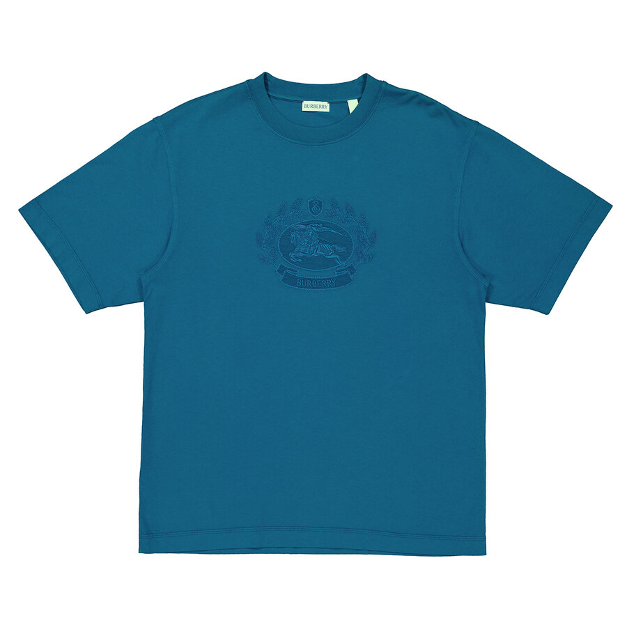 Burberry Men's Tops. Fashion category: T-Shirts & Henleys. SKU: 8093597. Material: Cotton. Color: Kingfisher. Burberry Oak Leaf Crest Embroidered Cotton Crewneck T-Shirt. This cotton t-shirt features a jersey texture, an embroidered logo at the chest with a crest motif, a crew neck, short sleeves, and a straight hem. 100% Cotton. Made in Portugal. GENERAL Brand Type: Designer Color: Kingfisher INFORMATION Brand: Burberry Gender: Mens Model: 8093597 DETAILS Category: Tops Apparel Type: T-Shirts & Henleys Material: Cotton ADDITIONAL INFO Jomashop Sku: -8093597N Department: Clothing