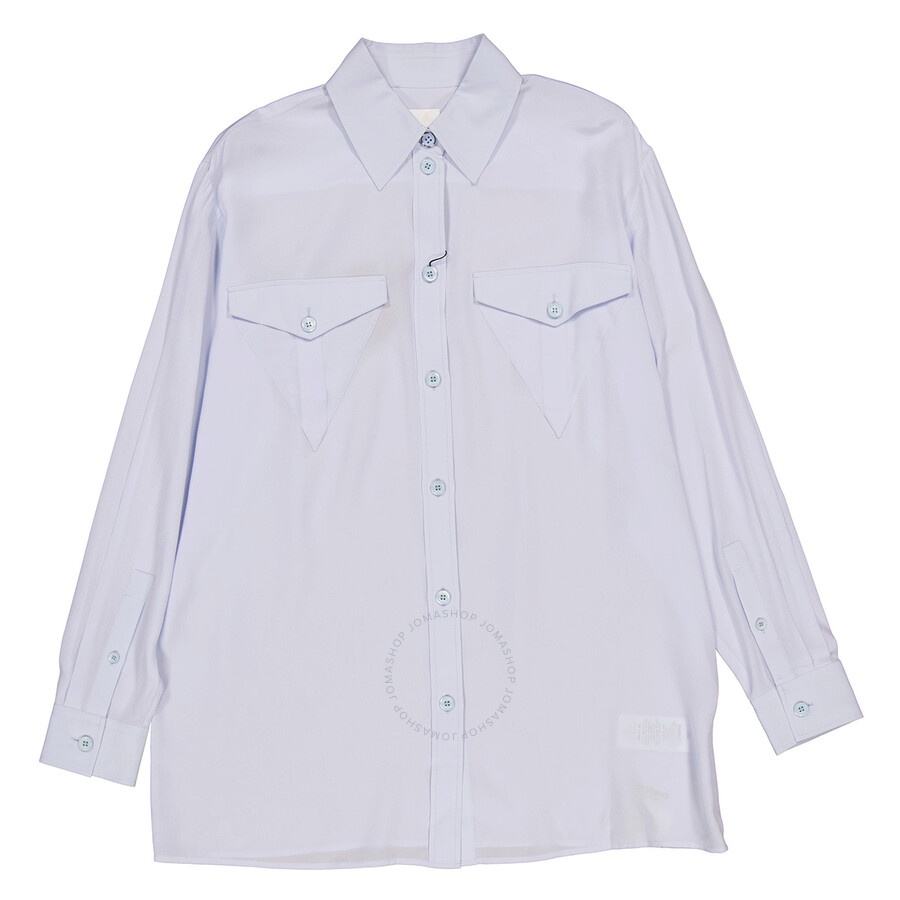 Burberry Ladies Tops. Fashion category: Casual Button-Downs. SKU: 8044688. Color: Pale Blue. Burberry Pale Blue Irem Silk Crepe De Chine Logo Detail Oversized Shirt. The Burberry oversized shirt cut from Italian-woven silk crepe de chine, finished with triangular button-through pockets and the brands logo detail. 100% Mulberry Silk. GENERAL Color: Pale Blue INFORMATION Brand: Burberry Gender: Womens Model: 8044688 DETAILS Category: Tops Apparel Type: Casual Button-Downs Material: Silk ADDITIONAL INFO Jomashop Sku: -8044688N Department: Apparel