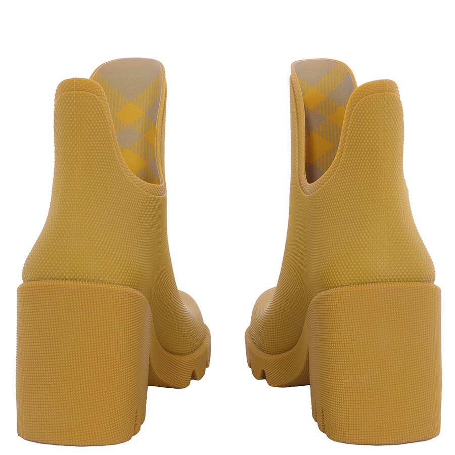 Burberry Ladies Boots. SKU: 8074661. Color: Manilla. Burberry Rubber Marsh Slip-On Ankle Boots. This ankle rubber boots features a round toe, ankle-length design, branded insole, rubber sole and a block heel. Outer: 100% Rubber. Lining: 78% Polyamide, 22% Elastane. Made in Italy Please visit the brand website for sizing information. INFORMATION Brand: Burberry Model: 8074661 Gender: Womens DETAILS Category: Boots Shoe Style: Ankle boots Shoe Style: Ankle boots Color: Manilla Shoe Vamp Style: Slip-on Upper Material: Rubber Sole Material: Rubber ADDITIONAL INFO Jomashop Sku: -8074661N Department: Shoes