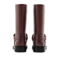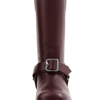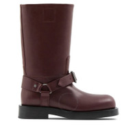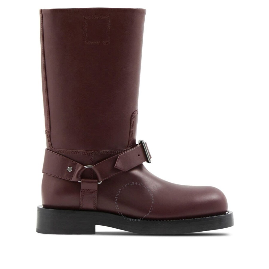 Burberry Ladies Boots. SKU: 8077375. Color: Aubergine. Vamp Style: Slip-on. Upper Material: Canvas. Lining Material: Calfskin. SoleMaterial: Leather. Burberry Saddle Buckled Leather Boots. This calf-length boot is made of calf leather and features a pull-on style with a buckle-fastening ankle strap. It has a round toe, a flat rubber sole, and a low stacked heel. Please visit the brand website for sizing information. INFORMATION Brand: Burberry Model: 8077375 Gender: Womens DETAILS Category: Boots Color: Aubergine Shoe Vamp Style: Slip-on Upper Material: Canvas Lining Material: Calfskin Sole Material: Leather ADDITIONAL INFO Jomashop Sku: -8077375N Department: Shoes
