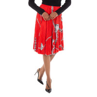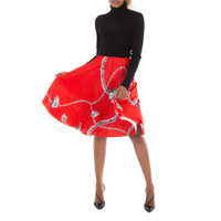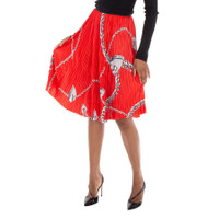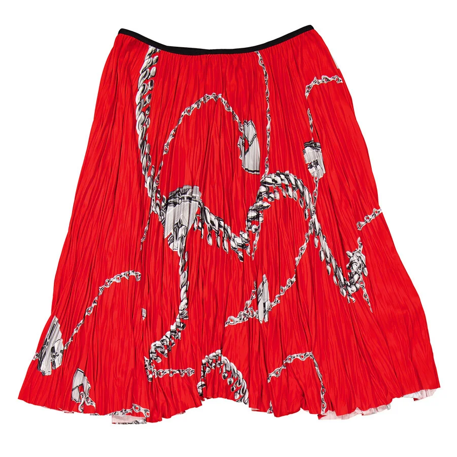 Burberry Ladies Bottoms. Fashion category: Skirts. SKU: 8089264. Color: Silver/Red. Burberry Shield Hardware Jersey Midi Skirt. This pleated skirt, made from heavyweight jersey, is printed with hand-painted artwork showcasing our jewelry and bag hardware. It features a subtle asymmetric hem, a contrasting grosgrain waistband, and a mid-length cut for a chic and contemporary look. 100% polyester. Made in Italy. GENERAL Brand Type: Designer Color: Silver/Red INFORMATION Brand: Burberry Gender: Womens Model: 8089264 DETAILS Category: Bottoms Apparel Type: Skirts Material: Polyester ADDITIONAL INFO Jomashop Sku: -8089264N Department: Clothing