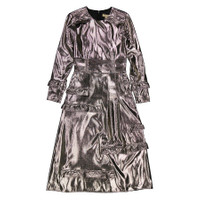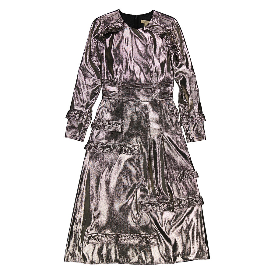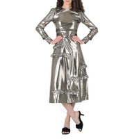 Burberry Ladies Dresses. SKU: 4068478. Color: Silver. Burberry Silver Long Sleeve lame dress with silver-tone silk blend ruffle trim with round neck, long sleeves, concealed zip fastening at the back, tight waist, flared skirt and mid-length length. Lining:100% Silk; Exterior: 61% Silk, 39% Metallic Polyester. Made in Italy. GENERAL Color: Silver INFORMATION Brand: Burberry Gender: Womens Model: 4068478 DETAILS Category: Dresses Apparel Type: Evening & Formal Gowns ADDITIONAL INFO Jomashop Sku: -4068478N Department: Apparel