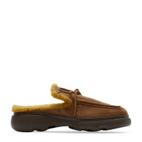 Burberry Men's Sandals. SKU: 8080053. Color: Wood. Burberry Stony Suede and Shearling Stony Mules. Italian-made mules crafted from calf suede and lined with shearling. The style features an Equestrian Knight Design tag, chunky rubber soles molded with archive Burberry lettering, a slip-on design, and a round toe for a blend of comfort and style. 100% calf suede. Made in Italy. Please visit the brand website for sizing information. GENERAL Brand Type: Designer INFORMATION Brand: Burberry Model: 8080053 Gender: Mens DETAILS Category: Sandals Shoe Style: Mules Shoe Style: Mules Color: Wood Shoe Vamp Style: Slip-on Upper Material: Calfskin;Suede Sole Material: Rubber ADDITIONAL INFO Jomashop Sku: -8080053N Department: Shoes