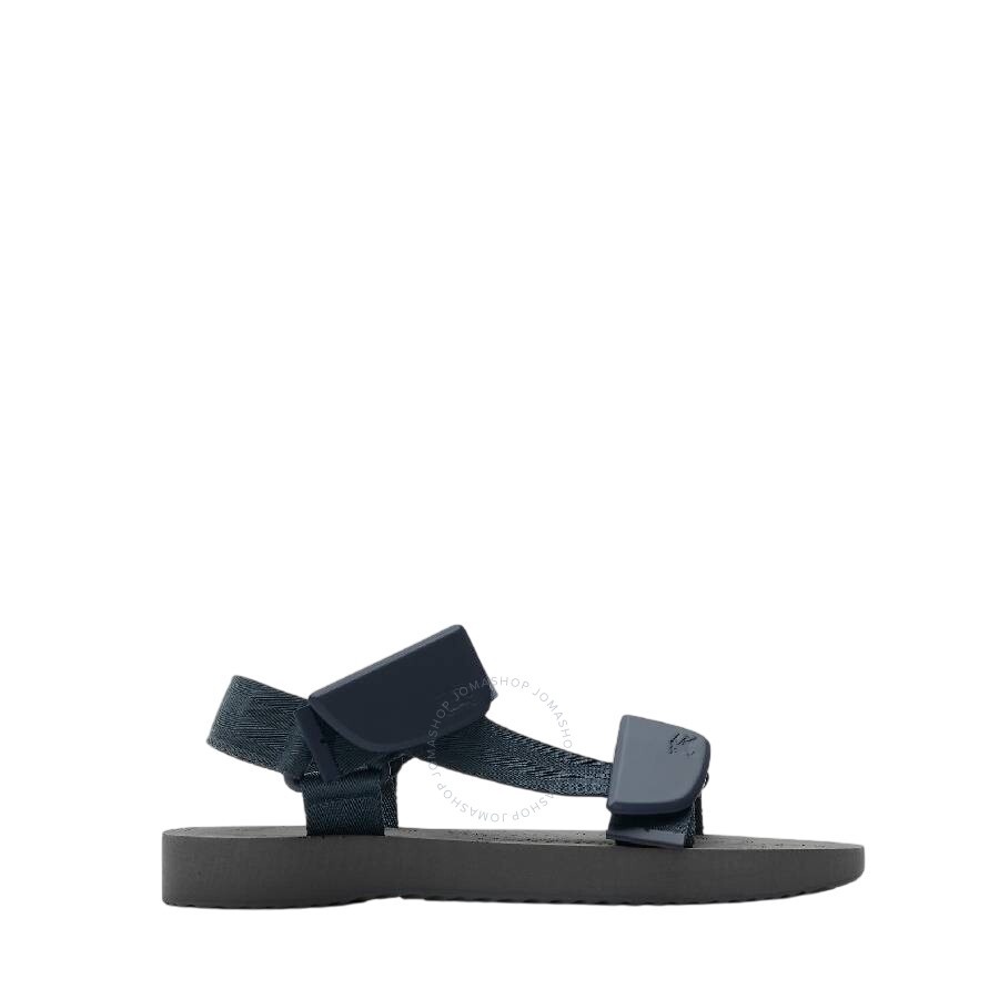 Burberry Ladies Sandals. SKU: 8088597. Burberry Equestrian Knight Trek Sandals. This sandal features a shield-shaped rubber buckle, a recessed Equestrian Knight pattern, an open toe, and a Burberry engraving on the sole. 80% Polyamide, 20% Brass. Made in Italy. Please visit the brand website for sizing information. GENERAL Brand Type: Designer INFORMATION Brand: Burberry Model: 8088597 Gender: Womens DETAILS Category: Sandals Color: Lake Shoe Vamp Style: Slip-on Upper Material: Polyester Lining Material: Polyester Sole Material: Leather ADDITIONAL INFO Jomashop Sku: -8088597N Department: Shoes