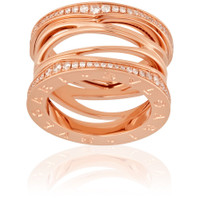 Store Display.Bvlgari Ladies Rings. B.zero1 series. SKU: AN858125. The B.zero1 Design Legend Four-Band Ring in 18K rose gold is a striking reinterpretation of Bulgari’s iconic B.zero1 collection, envisioned by the legendary architect Zaha Hadid. Inspired by the grandeur of the Colosseum, this masterpiece merges geometric precision with fluidity, creating a harmonious blend of modern innovation and timeless tradition. The four-band design is accentuated by pave diamonds (0.61 ct) delicately set along the edges, adding brilliance to its sculptural form. A true fusion of ancient heritage and contemporary artistry. Made in Italy. GENERAL Box: No Papers: No Brand Type: Designer INFORMATION Brand: Bvlgari Gender: Womens Model: 354205.SD DETAILS Size Info: 50 ADDITIONAL INFO Jomashop Sku: BVL354205-SD Department: Jewelry Category: Rings