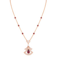 Bvlgari Necklaces. Diva series. SKU: 356953. The Divas' Dream 18 kt Rose Gold Openwork Necklace is a stunning expression of Italian elegance. Featuring an intricate openwork fan-shaped motif, this exquisite piece is adorned with a pear-shaped ruby, round brilliant-cut rubies, a round brilliant-cut diamond, and pave diamonds. Inspired by the mosaics of the Roman Baths of Caracalla, the design embodies Bvlgari’s deep connection to the Eternal City, blending timeless sophistication with modern artistry. Gemstone:Diamonds, Rubies. Diamonds (Carats):0.86. GENERAL Brand Type: Designer Collection Name: Diva INFORMATION Brand: Bvlgari Series: Diva Gender: Womens Model: 356953 DETAILS Ring Style: Fashion Material : Rose Gold Metal Stamp: 18K Stone Type: Diamond Stone Weight: 0.86 ADDITIONAL INFO UPC Code: 8034024623800 Jomashop Sku: BVL356953 Department: Jewelry Category: Necklaces
