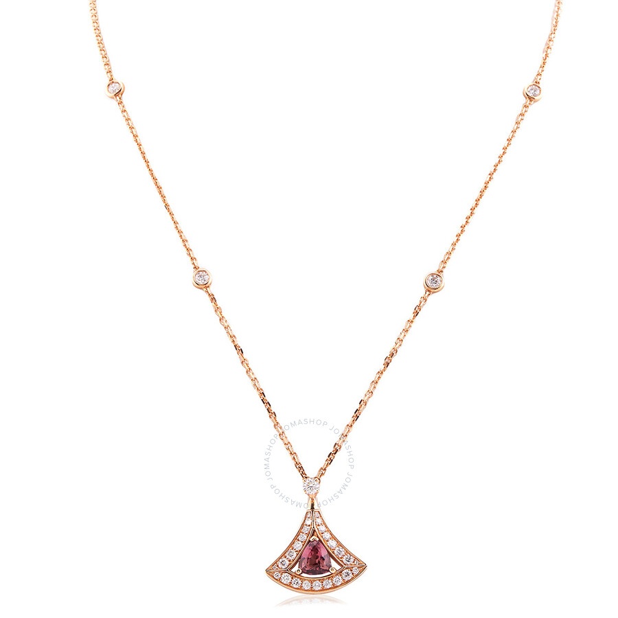 Bvlgari Ladies Necklaces. SKU: 354366. Color: Pink. Metal Type: Rose Gold. Metal Stamp: 18k. Gem stone type: Diamond. Necklace style: Pendant. Bvlgari Divas Dream 18 kt Rose Gold Openwork Necklace. The Divas' Dream openwork necklace features an 18 kt rose gold chain adorned with 1.15 carats of pave-set diamonds and a delicate pendant showcasing a pink tourmaline, inspired by the graceful curves and marble hues of Rome’s Caracalla Baths to embody Italian elegance and feminine sophistication. Pendant Height: 2,4 cm. Chain length: 41 cm - 43 cm. Made in Italy. GENERAL Box: No Papers: No Brand Type: Designer Color: Pink INFORMATION Brand: Bvlgari Gender: Womens Model: 354366 DETAILS Necklaces: Pendant Closure Type: Lobster Material : Rose Gold Metal Stamp: 18K Stone Type: Diamond ADDITIONAL INFO UPC Code: 8034024579954 Jomashop Sku: Z-DAU36 Department: Jewelry Category: Necklaces