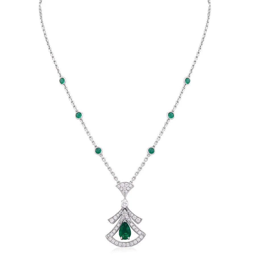 Bvlgari Necklaces. Diva series. SKU: 356955. The Divas' Dream 18 kt White Gold Openwork Necklace is a celebration of timeless Italian elegance and the enchanting spirit of a diva. Featuring a delicate openwork design, this exquisite piece is adorned with a pear-shaped emerald, round brilliant-cut emeralds, a round brilliant-cut diamond, and pave diamonds. Inspired by the intricate mosaics of the Roman Baths of Caracalla, the fan-shaped motif reflects Bvlgari’s deep-rooted connection to the Eternal City. The interplay of full and empty spaces lends an airy, refined touch, making this necklace a sophisticated expression of grace and beauty. Due to the artisanal craftsmanship, all dimensions and weight measurements are approximate. Gemstone:Emeralds, Diamonds. Diamonds (Carats):0.86. GENERAL Brand Type: Designer Color: White Gold Collection Name: Diva INFORMATION Brand: Bvlgari Series: Diva Gender: Womens Model: 356955 DETAILS Necklaces: Pendant Ring Style: Fashion Material : White Gold Metal Stamp: 18K Stone Type: Diamond Stone Weight: 0.86 ADDITIONAL INFO UPC Code: 8034024623824 Jomashop Sku: BVL356955 Department: Jewelry Category: Necklaces