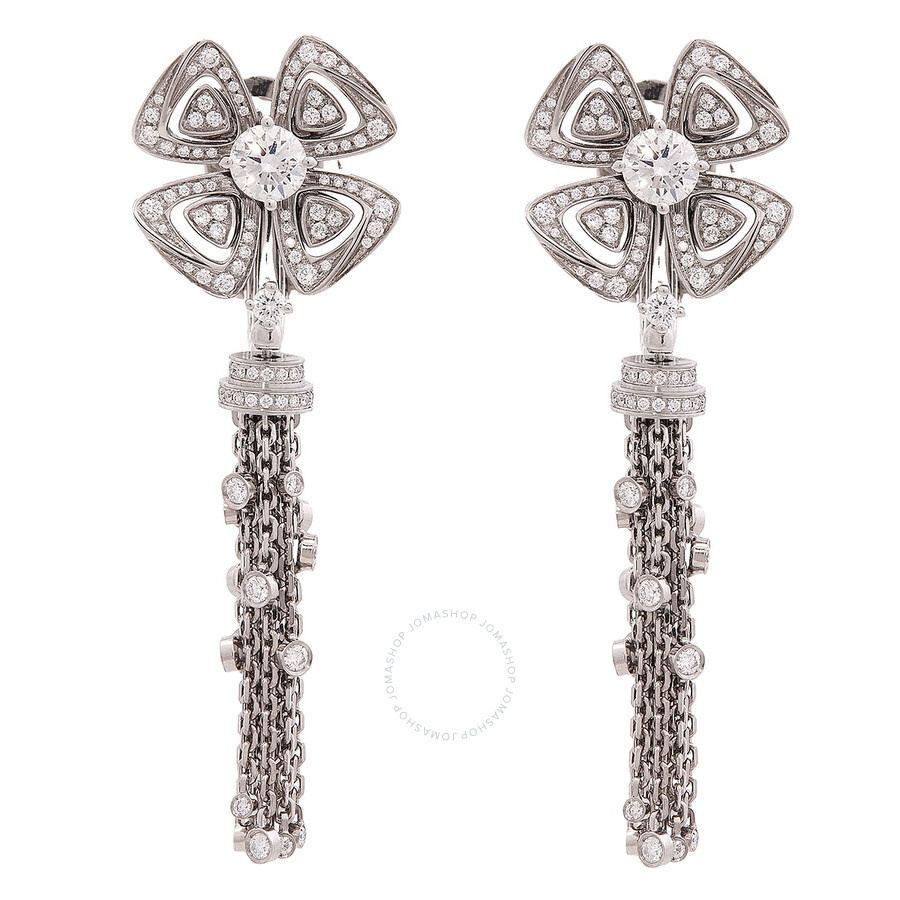 Bvlgari Earrings. Fiorever series. SKU: 354528. Metal Type: White Gold. Metal Stamp: 18k. Gem stone type: Diamond. Stone weight: 1.52ct. Bvlgari Fiorever 18 Kt White Gold Diamonds Earrings. The Fiorever earrings in 18 kt white gold feature a sparkling diamond flower adorned with pave diamonds and delicate dangling fringes, with a total diamond weight of 1.52 carats. GENERAL Box: No Papers: No Brand Type: Designer Collection Name: Fiorever INFORMATION Brand: Bvlgari Series: Fiorever Gender: Womens Model: 354528 DETAILS Earrings: Drop/Dangle Material : White Gold Metal Stamp: 18K Stone Type: Diamond Stone Weight: 1.52 ADDITIONAL INFO UPC Code: 8034024581773 Jomashop Sku: Z-KXEFA Department: Jewelry Category: Earrings