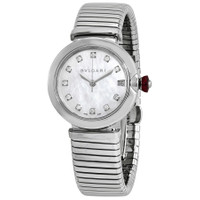 Stainless steel case with a stainless steel (tubogas) bracelet. Fixed stainless steel bezel. Mother of pearl dial with silver-tone hands and diamond hour markers. Dial Type: Analog. Date display at the 3 o'clock position. Automatic movement. Scratch resistant sapphire crystal. Pull / push crown set with a synthetic cabochon-cut rubellite and a single diamond. Transparent case back. Round case shape. Case size: 33 mm. Fold over clasp with a push button release. Water resistant at 50 meters / 165 feet. Functions: date, hour, minute, second. Lucea Series. Dress watch style. Watch label: Swiss Made. Bvlgari Lucea Automatic Diamond Mother of Pearl Dial Ladies Watch 103100. INFORMATION Brand: Bvlgari Series: Lucea Collection Name: Lucea Gender: Womens Model: 103100 Watch Label: Swiss Made Movement: Automatic CASE Case Size: 33 mm Case Material: Stainless Steel Case Shape: Round Case Back: Transparent BAND Band Material: Stainless Steel (Tubogas) Band Type: Bracelet Band Color: Silver-tone Clasp: Fold Over with Push Button Release DIAL Dial Color: Mother of Pearl Type: Analog Crystal: Scratch Resistant Sapphire Hands: Silver-tone Dial Markers: Diamond Bezel: Fixed Bezel Color: Silver-tone Bezel Material: Stainless Steel Crown: Pull / Push FEATURES Water Resistance: 50 meters / 165 feet Calendar: Date display at the 3 o'clock position Functions: Date, Hour, Minute, Second Watch Features: Diamond, Stainless Steel, Analog ADDITIONAL INFO Watch Style: Dress Warranty: 2 Year Jomashop Warranty Jomashop Sku: BVL103100 Department: Watches Category: Watches