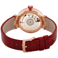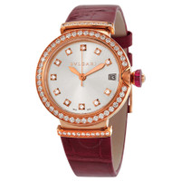 18kt rose gold case with a bordeaux red (alligator) leather strap. Fixed 18kt rose gold bezel set with diamonds. Diamond-set lugs. Silver satine soleil dial with rose gold hands and diamond hour markers. Dial Type: Analog. Date display at the 3 o'clock position. Automatic movement. Scratch resistant sapphire crystal. Pull / push crown. Transparent case back. Round case shape. Case size: 33 mm. Tang clasp. Water resistant at 50 meters / 165 feet. Functions: date, hour, minute, second. Lvcea Series. Luxury watch style. Watch label: Swiss Made. Item Variations: LUP33C6GDLD/11. Bvlgari Lvcea Automatic Silver Dial 18kt Rose Gold Ladies Watch 102329. INFORMATION Brand: Bvlgari Series: Lvcea Collection Name: Lvcea Gender: Womens Model: 102329 Watch Label: Swiss Made Movement: Automatic CASE Case Size: 33 mm Case Material: 18kt Rose Gold Case Shape: Round Case Back: Transparent BAND Band Material: (Alligator) Leather Band Type: Strap Band Color: Bordeaux Red Clasp: Tang DIAL Dial Color: Silver Satine Soleil Type: Analog Crystal: Scratch Resistant Sapphire Hands: Rose Gold Dial Markers: Diamond Bezel: Fixed Bezel Material: 18kt Rose Gold set with Diamonds Crown: Pull / Push FEATURES Water Resistance: 50 meters / 165 feet Calendar: Date display at the 3 o'clock position Functions: Date, Hour, Minute, Second Watch Features: Diamond, Leather, Gold, Analog, Alligator Leather ADDITIONAL INFO Watch Style: Luxury Warranty: 2 Year Jomashop Warranty UPC Code: 7612902052655 Jomashop Sku: BVL102329 Item Variation: LUP33C6GDLD/11 Department: Watches Category: Watches
