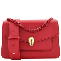 Bvlgari Ladies Crossbody. Serpenti Forever series. SKU: 290766. Color: Red. Size: 25 x 16.5 x 8 cm. Bvlgari Serpenti Forever Red Ladies Crossbody 290766. The Serpenti Forever Crossbody Bag by Bvlgari showcases a modern silhouette with an everyday flair. Crafted in luxurious nappa leather, it features gold-plated brass hardware, including a striking reinterpretation of the iconic Serpenti head closure. A Bvlgari chain adorns the flap, doubling as an elegant handle. The bag offers versatility with two gussets, a detachable and adjustable leather strap, and multiple pockets, including a front pocket, back patch pocket, open pocket, and zipped partition. Material?: Nappa leather. Made in Italy. GENERAL Size Info: 25 x 16.5 x 8 cm Color: Red Collection Name: Serpenti Forever INFORMATION Brand: Bvlgari Series: Serpenti Forever Gender: Womens Model: 290766 DETAILS Material: Nappa Leather Closure: Flap ADDITIONAL INFO Jomashop Sku: BV290766 Department: Bags Category: Crossbody