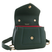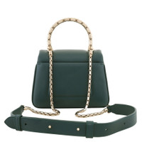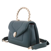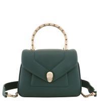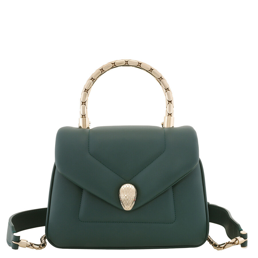 Bvlgari Ladies Top Handle Bag. SKU: 292127. Color: Green. The Serpenti Reverse small top handle bag in forest emerald green quilted Metropolitan calf leather exudes luxury with its beetroot spinel fuchsia nappa leather lining. Finished with a captivating snakehead magnetic closure in light gold-plated brass, featuring striking red enamel eyes, this elegant piece blends bold design with timeless sophistication. Material: Calf leather. . 20 x 14 x 10 x cm - 7.9 x 5.5 x 3.9 inches. Made in Italy. GENERAL Size Info: - 7.9 x 5.5 x 3.9 inches Brand Type: Designer Color: Green INFORMATION Brand: Bvlgari Gender: Womens Model: 292127 DETAILS Material: Leather Closure: Magnetic Snap DIMENSIONS Size: Small ADDITIONAL INFO Jomashop Sku: BVL292127 Department: Bags Category: Top Handle Bag