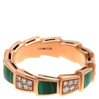 Store Display.Bvlgari Rings. SKU: 355022.SD. Serpenti Viper Ring. Inspired by the viper’s hypnotic movement, this Serpenti Viper ring coils elegantly around the finger, embodying sensuality and power. The sinuous design, featuring 18K rose gold, malachite inserts, and pave diamonds, captures the dual nature of the serpent—mystery and desire, light and shadow. A striking fusion of sophistication and seduction. Details: Material: 18K Rose Gold Gemstones: Malachite Inserts, Pave Diamonds Diamonds (Carats): 0.34. GENERAL Box: No Papers: No Brand Type: Designer Item Variation: AN858203 INFORMATION Brand: Bvlgari Gender: Womens Model: 355022.SD DETAILS Size Info: 50 ADDITIONAL INFO Jomashop Sku: BVL355022-SD Department: Jewelry Category: Rings