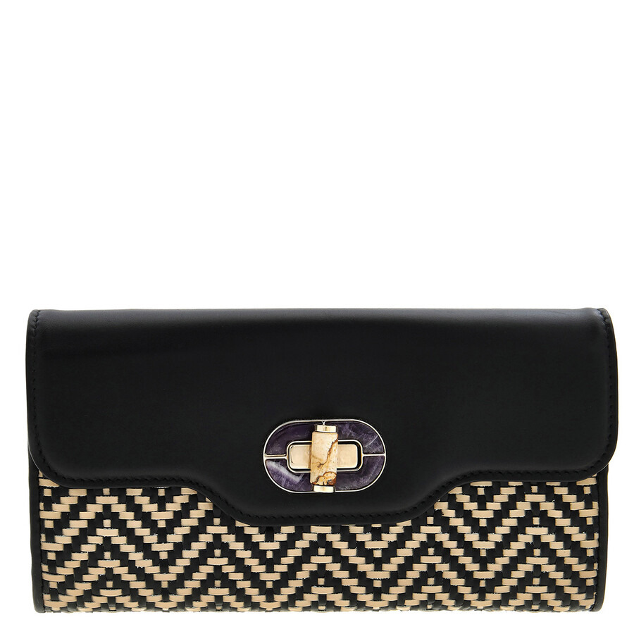 Bvlgari Ladies Wallets. SKU: 36752. Color: Black. Bvlgari Woven Raffia Rossellini Flap Wallet. Made from smooth black leather and detailed with a chic black-and-beige chevron woven raffia base, it adds a touch of modern sophistication to your accessories collection. The standout feature is its distinctive turn-lock closure, adorned with a striking natural stone accent set in a purple-toned frame with gold-tone hardware. Inside, the wallet offers a thoughtfully organized interior with multiple compartments and a zippered pocket for coins or essentials. Made in Italy. GENERAL Brand Type: Designer Color: Black INFORMATION Brand: Bvlgari Gender: Womens Model: 36752 DETAILS Closure: Twist & Lock ADDITIONAL INFO UPC Code: 7612391367520 Jomashop Sku: Z-FSBBL Department: Bags Category: Wallets