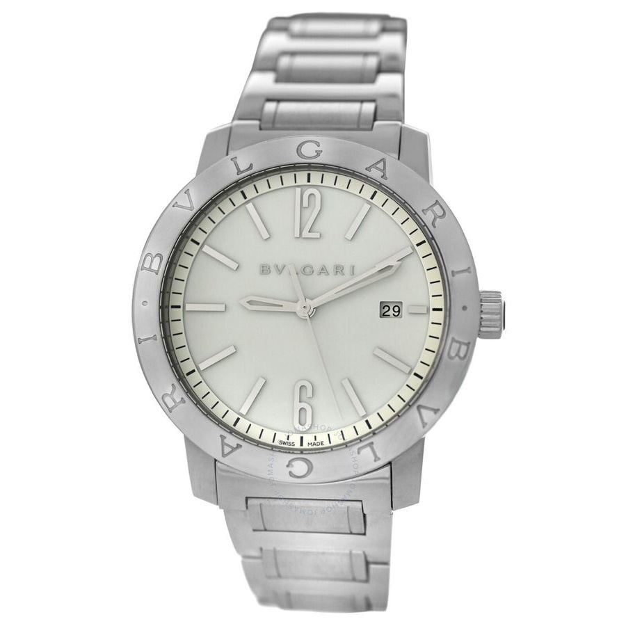 Silver-tone stainless steel case and bracelet. Fixed silver-tone stainless steel bezel. White dial with silver-tone hands and Arabic numeral & index hour markers. Minute markers around the outer rim. Dial Type: Analog. Date display at the 3 o'clock position. Automatic movement. Solid case back. Round case shape, case size: 41 mm. Fold over clasp with a safety release. Functions: date, hour, minute, second. Bvlgari Series. Casual watch style. Watch label: Swiss Made. Pre-owned Bvlgari Bvlgari Automatic White Dial Men's Watch BB 41 S. GENERAL Collection Name: Bvlgari INFORMATION Brand: Bvlgari Series: Bvlgari Model: BB 41 S Gender: Mens Watch Label: Swiss Made Movement: Automatic CONDITION INFORMATION Box: Yes Preowned Item Condition: Excellent Papers: Yes Comments: Bvlgari BvlgariBvlgari BB 41 S Stainless Steel Date 41MM Men's Automatic Watch. The watch is near mint condition, with no visible scratches to the naked eye, but may have some tiny scratches visible under very close-up inspection. The only exception is the small scratches on the back case. The watch was correctly polished by a professional polisher with beautiful matte and steel details. The watch comes in the original watch box, maintenance booklet, information booklet, instructions booklet, au CASE Case Size: 41 mm Case Material: Stainless Steel Case Shape: Round Case Back: Solid DIAL Type: Analog Dial Color: White Hands: Silver-tone Second Markers: Minute Markers around the outer rim Dial Markers: Arabic Numeral & Index Bezel: Fixed Bezel Color: Silver-tone Bezel Material: Stainless Steel BAND Band Type: Bracelet Band Material: Stainless Steel Band Color: Silver-tone Clasp: Fold Over with Safety Release FEATURES Calendar: Date display at the 3 o'clock position Functions: Date, Hour, Minute, Second Watch Features: Stainless Steel, Analog ADDITIONAL INFO Watch Style: Casual Warranty: 1 Year Jomashop Warranty Jomashop Sku: PRE-P-BVL81939 Department: Watches