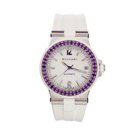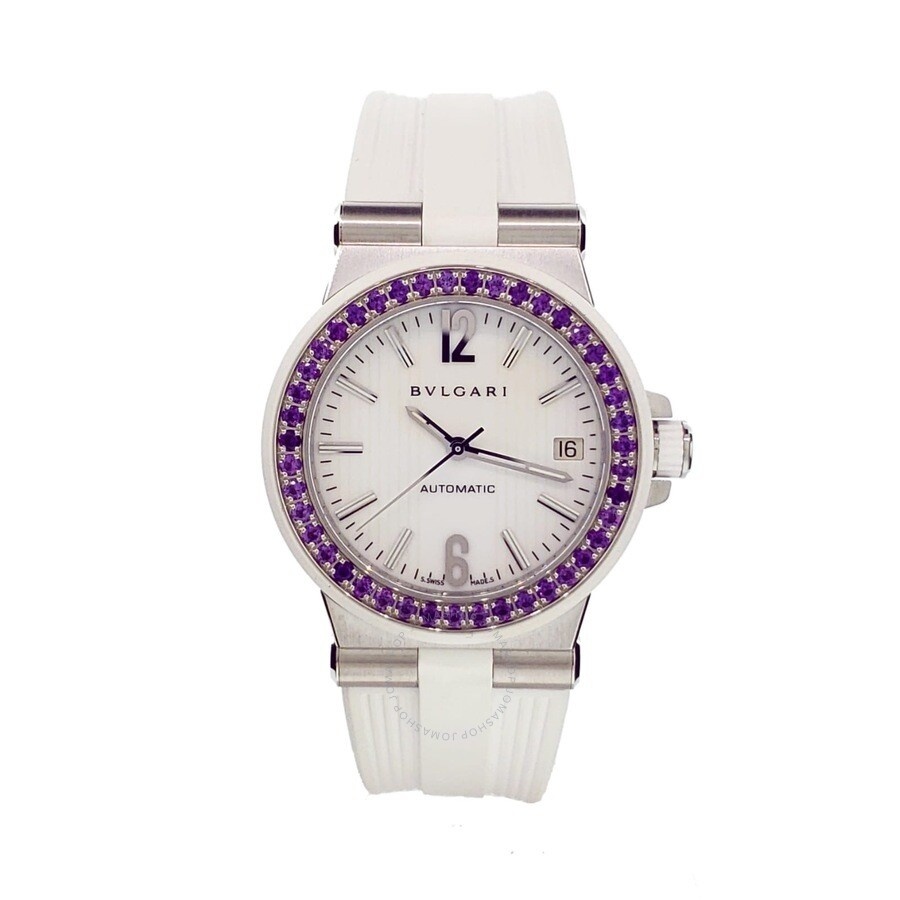 Silver-tone stainless steel case with a white rubber strap. Fixed bezel. White dial with silver-tone hands and Arabic numeral hour markers. Minute markers around the outer rim. Dial Type: Analog. Luminescent hands and markers. Date display at the 3 o'clock position. Automatic movement with a 40-hour power reserve. Scratch resistant sapphire crystal. Pull / push crown. Solid case back. Round case shape, case size: 35 mm. Tang clasp. Water resistant at 100 meters / 330 feet. Functions: date, hour, minute, second. Diagono Series. Luxury watch style. Watch label: Swiss Made. Item Variations: DG35WSWVD. Pre-owned Bvlgari Diagono Automatic White Dial Ladies Watch DG 35 S. Box: No ,Paper: No GENERAL Collection Name: Diagono INFORMATION Brand: Bvlgari Series: Diagono Model: DG 35 S Gender: Womens Watch Label: Swiss Made Movement: Automatic Power Reserve: 40 hours CONDITION INFORMATION Box: No Preowned Item Condition: Excellent Papers: No Year: 2016 CASE Case Size: 35 mm Case Material: Stainless Steel Case Shape: Round Case Back: Solid DIAL Type: Analog Dial Color: White Crystal: Scratch Resistant Sapphire Hands: Silver-tone Second Markers: Minute Markers around the outer rim Dial Markers: Arabic Numeral Luminiscence: Hands and Markers Bezel: Fixed Crown: Pull / Push BAND Band Type: Strap Band Material: Rubber Band Color: White Clasp: Tang FEATURES Water Resistance: 100 meters / 330 feet Calendar: Date display at the 3 o'clock position Functions: Date, Hour, Minute, Second Watch Features: Stainless Steel, Rubber, Analog ADDITIONAL INFO Watch Style: Luxury Warranty: 1 Year Jomashop Warranty Jomashop Sku: PRE-P-BVL39081 Item Variation: DG35WSWVD Department: Watches Category: Watches