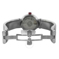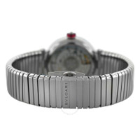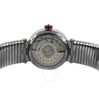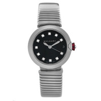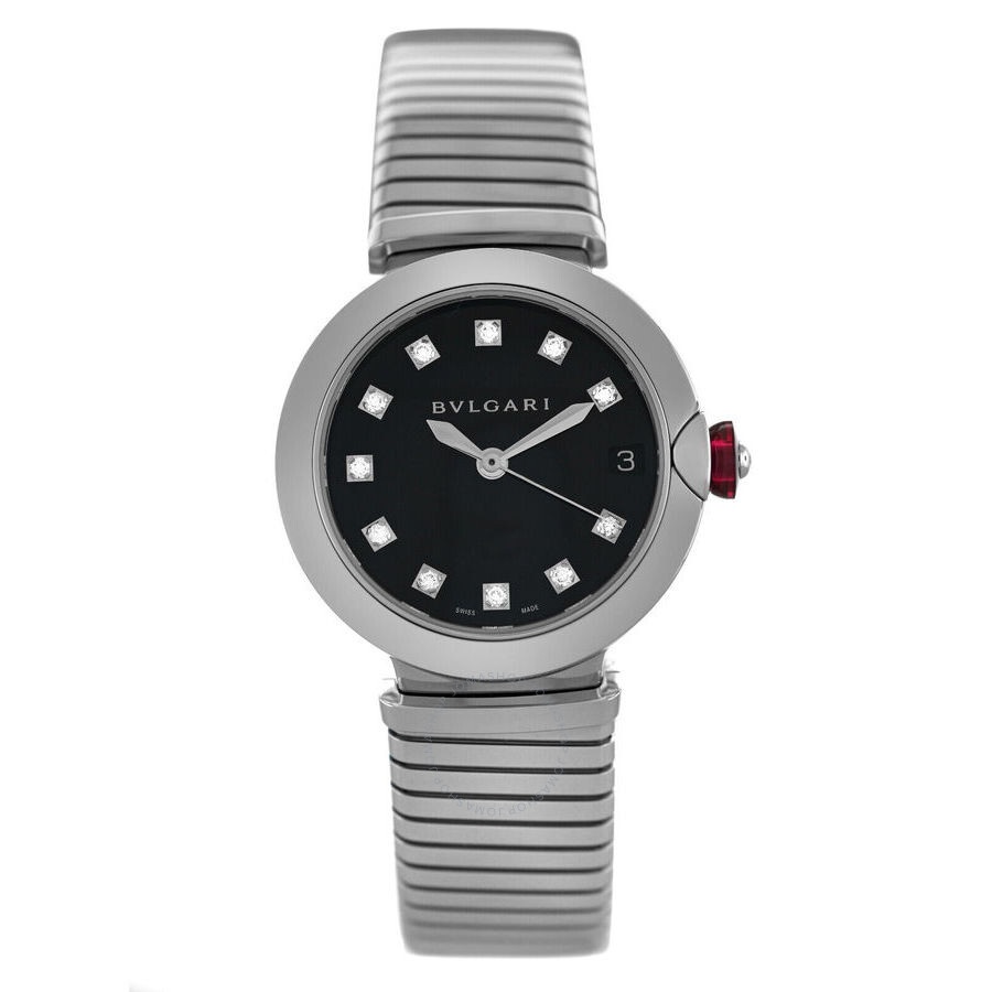 Silver-tone stainless steel case and bracelet. Fixed silver-tone stainless steel bezel. Black dial with silver-tone hands and diamond hour markers. Dial Type: Analog. Date display at the 3 o'clock position. Automatic movement. Scratch resistant sapphire crystal. Pull / push crown. Transparent see through case back. Round case shape, case size: 33 mm. Band length: 6.75 inches. Fold over clasp with a safety release. Water resistant at 50 meters / 165 feet. Functions: date, hour, minute, second. Lvcea Series. Luxury watch style. Watch label: Swiss Made. Item Variations: LU33S, "LU33WSSD/11.T. Pre-owned Bvlgari Lvcea Automatic Diamond Black Dial Ladies Watch 102953. GENERAL Brand Type: Designer Collection Name: Lvcea INFORMATION Brand: Bvlgari Series: Lvcea Model: 102953 Gender: Womens Watch Label: Swiss Made Movement: Automatic CONDITION INFORMATION Box: No Preowned Item Condition: Unworn / Like New Papers: No Comments: The new store display model watch comes exactly as shown in the photos, no box. It does not have signs of wear but might have micro scratches due to handling. This watch fits the ladies' wrist up to 6.75 inches. Authenticity is 100% guaranteed. CASE Case Diameter: 33 Case Material: Stainless Steel Case Shape: Round Case Back: Transparent See Through DIAL Type: Analog Dial Color: Black Crystal: Scratch Resistant Sapphire Hands: Silver-tone Dial Markers: Diamond Bezel: Fixed Bezel Color: Silver-tone Bezel Material: Stainless Steel Crown: Pull / Push BAND Band Type: Bracelet Band Material: Stainless Steel Band Color: Silver-tone Band Length: 6.75 inches Clasp: Fold Over with Safety Release FEATURES Water Resistance: 50 meters / 165 feet Calendar: Date display at the 3 o'clock position Functions: Date, Hour, Minute, Second Watch Features: Analog, Stainless Steel, Diamond ADDITIONAL INFO Watch Style: Luxury Warranty: 1 Year Jomashop Warranty Jomashop Sku: PRE-P-BVL97680 Item Variation: LU33S, "LU33WSSD/11.T Department: Watches