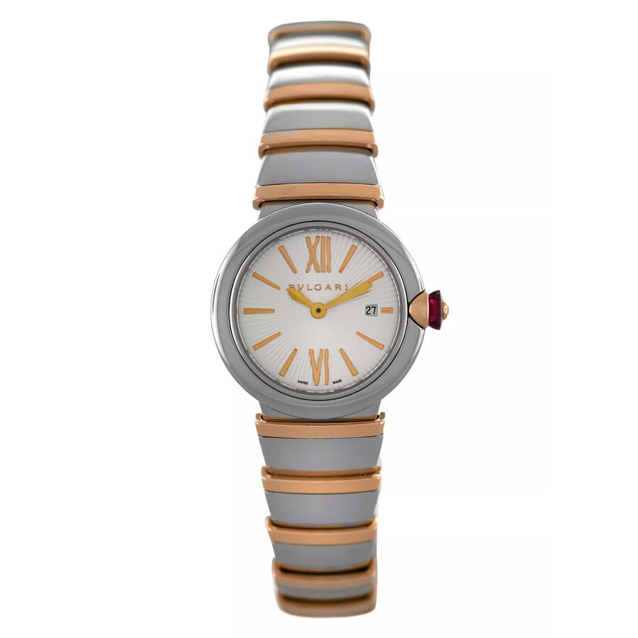 Silver-tone stainless steel case with a two-tone (silver-tone and rose gold-tone) 18kt rose gold and stainless steel bracelet. Fixed silver-tone stainless steel bezel. Silver-tone dial with rose gold-tone hands and Arabic numeral & Roman numeral hour markers. Dial Type: Analog. Date display at the 3 o'clock position. Bvlgari Calibre B046 quartz movement. Scratch resistant sapphire crystal. Pull / push crown. Solid case back. Round case shape, case size: 28 mm. Band length: 7 inches. Fold over clasp with a safety release. Water resistant at 50 meters / 165 feet. Functions: date, hour, minute. Lvcea Series. Luxury watch style. Item Variations: LU P 28 SG, LU28C6SSPGD. Pre-owned Bvlgari Lvcea Quartz Silver Dial Ladies Watch 102193. GENERAL Collection Name: Lvcea INFORMATION Brand: Bvlgari Series: Lvcea Model: 102193 Gender: Womens Movement: Quartz Engine: Bvlgari Calibre B046 CONDITION INFORMATION Box: No Preowned Item Condition: Mint Papers: Yes Comments: This watch is in near-mint condition. There are no visible scratches to the naked eye, but it might have some micro scratches that are visible under magnification. It comes with an international warranty booklet, and it was originally purchased in 2015. The watch fits a lady's wrist up to 6.25 inches. The model numbers are present on the back case. Authenticity is 100% guaranteed. CASE Case Size: 28 Case Material: Stainless Steel Case Shape: Round Case Back: Solid DIAL Type: Analog Dial Color: Silver-tone Crystal: Scratch Resistant Sapphire Hands: Rose Gold-tone Dial Markers: Arabic Numeral & Roman Numeral Bezel: Fixed Bezel Color: Silver-tone Bezel Material: Stainless Steel Crown: Pull / Push BAND Band Type: Bracelet Band Material: 18kt Rose Gold and Stainless Steel Band Color: Two-tone (Silver-tone and Rose Gold-tone) Band Length: 7 inches Clasp: Fold Over with Safety Release FEATURES Water Resistance: 50 meters / 165 feet Calendar: Date display at the 3 o'clock position Functions: Date, Hour, Minute Watch Features: Analog, Gold, Stainless Steel ADDITIONAL INFO Watch Style: Luxury Warranty: 1 Year Jomashop Warranty Jomashop Sku: PRE-P-BVL96177 Item Variation: LU P 28 SG, LU28C6SSPGD Department: Watches