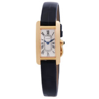 18kt yellow gold case with a navy blue alligator leather strap. Fixed 18kt yellow gold bezel. Silver-tone dial with blue hands and Roman numeral hour markers. Minute markers around the inner rim. Dial Type: Analog. Quartz movement. Scratch resistant sapphire crystal. Pull / push crown. Solid case back. Rectangle case shape, case size: 28 mm x 15.2 mm, case thickness: 6.5 mm. Buckle clasp. Water resistant at 30 meters / 100 feet. Functions: hour, minute. American Tank Series. Luxury watch style. Watch label: Swiss Made. Cartier American Tank Quartz Silver Dial Ladies Watch WGTA0353. GENERAL Box Type: Original Box CASE Case Thickness: 6.5 mm Case Material: 18kt Yellow Gold Case Shape: Rectangle Case Back: Solid BAND Band Material: Alligator Leather Band Type: Strap Band Color: Navy Blue Clasp: Buckle DIAL Dial Color: Silver-tone Type: Analog Crystal: Scratch Resistant Sapphire Hands: Blue Dial Markers: Roman Numeral Second Markers: Minute Markers around the inner rim Bezel: Fixed Bezel Material: 18kt Yellow Gold Crown: Pull / Push INFORMATION Brand: Cartier Series: American Tank Collection Name: American Tank Gender: Womens Model: WGTA0353 Watch Label: Swiss Made Movement: Quartz FEATURES Water Resistance: 30 meters / 100 feet Functions: Hour, Minute Watch Features: Alligator Leather, Analog, Gold, Leather ADDITIONAL INFO Watch Style: Luxury Warranty: 2 Year Jomashop Warranty Jomashop Sku: CRTWGTA0353 Department: Watches