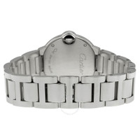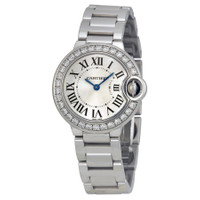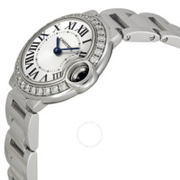 18kt white gold case and bracelet. Fixed 18kt white gold bezel set with diamonds. Silver opaline dial with blue hands and Roman numeral hour markers. Minute markers around an inner ring. Luminescent hands and dial markers. Battery operated calibre 057 quartz movement. Scratch resistant sapphire crystal. 18kt white gold fluted crown with sapphire cabochon. Solid case back. Case diameter: 28.5 mm. Case thickness: 9.35 mm. Deployment clasp. Water resistant at 30 meters / 100 feet. Functions: hour and minutes. Cartier Ballon Bleu 18kt White Gold Ladies Watch WE9003Z3. GENERAL Color: Blue / Gold / Silver / White INFORMATION Brand: Cartier Series: Ballon Bleu De Cartier Collection Name: Ballon Bleu de Cartier Gender: Womens Model: WE9003Z3 Watch Label: Swiss Made Movement: Quartz Engine: Cartier Calibre 057 CASE Case Size: 28.5 mm Case Thickness: 9.35 mm Case Material: 18kt White Gold Case Shape: Round Case Back: Solid BAND Band Material: 18kt White Gold Band Type: Bracelet Band Color: White Gold-tone Clasp: Deployment DIAL Dial Color: Silver Opaline Type: Analog Crystal: Scratch Resistant Sapphire Hands: Blued-steel Sword-shaped Dial Markers: Roman Numeral Second Markers: Minute Markers Around The Inner Ring Luminiscence: Hands and Dial Markers Bezel: Fixed 18kt White Gold set with Diamonds Crown: 18kt White Gold Fluted with Sapphire Cabocho FEATURES Water Resistance: 30 meters / 100 feet Functions: Hour, Minute Watch Features: Diamond, Gold, Analog ADDITIONAL INFO Watch Style: Luxury Warranty: 2 Year Jomashop Warranty UPC Code: 845960003629 Jomashop Sku: CRTWE9003Z3 Department: Watches Category: Watches