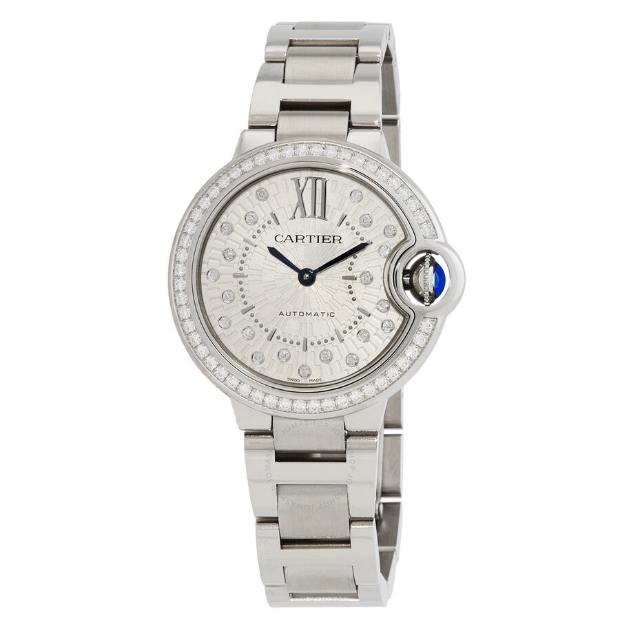 Silver-tone stainless steel case and bracelet. Fixed silver-tone stainless steel bezel set with 50 diamonds totaling 0.57 carats. Matte silvered sunray-brushed dial with blued-steel hands and diamond-Roman numeral hour markers. Roman numeral marker appears at the 12 o'clock position. Dial Type: Analog. Automatic movement. Scratch resistant sapphire crystal. Fluted crown set with a synthetic cabochon-shaped spinel. Solid case back. Round case shape, case size: 33 mm, Water resistant at 30 meters / 100 feet. Functions: hour, minute. Ballon Bleu Series. Luxury watch style. Watch label: Swiss Made. Cartier Ballon Bleu Automatic Diamond Silver Dial Ladies Watch W4BB0035. INFORMATION Brand: Cartier Series: Ballon Bleu Collection Name: Ballon Bleu Gender: Womens Model: W4BB0035 Watch Label: Swiss Made Movement: Automatic CASE Case Size: 33 mm Case Material: Stainless Steel Case Shape: Round Case Back: Solid BAND Band Material: Stainless Steel Band Type: Bracelet Band Color: Silver-tone DIAL Dial Color: Silver Type: Analog Crystal: Scratch Resistant Sapphire Hands: Blued-steel Dial Markers: Diamond-Roman Numeral Second Markers: Roman Numeral Marker appears at the 12 o'clock position Bezel: Fixed Bezel Color: Silver-tone Bezel Material: Stainless Steel set with 50 diamonds totaling 0.57 carats Crown: Fluted set with a synthetic cabochon-shaped spinel FEATURES Water Resistance: 30 meters / 100 feet Functions: Hour, Minute Watch Features: Diamond, Stainless Steel, Analog ADDITIONAL INFO Watch Style: Luxury Warranty: 2 Year Jomashop Warranty Jomashop Sku: CRTW4BB0035 Department: Watches Category: Watches