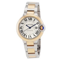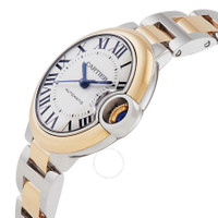 Silver-tone stainless steel case with a two-tone (silver-tone and yellow gold-tone) stainless steel and 18kt yellow gold bracelet. Fixed yellow gold-tone 18kt yellow gold bezel. Silver-tone dial with blued-steel sword-shaped hands and Roman numeral hour markers. Minute scale around the inner rim. Dial Type: Analog. Automatic movement. Scratch resistant sapphire crystal. Cabochon crown. Round case shape, case size: 33 mm, case thickness: 10.16 mm. Fold over clasp with a safety release. Water resistant at 30 meters / 100 feet. Functions: hour, minute, second. Ballon Bleu Series. Luxury watch style. Watch label: Swiss Made. Cartier Ballon Bleu Automatic Silver Dial Ladies Watch W2BB0037. CASE Case Size: 33 Case Thickness: 10.16 mm Case Material: Stainless Steel Case Shape: Round BAND Band Material: Stainless Steel and 18kt Yellow Gold Band Type: Bracelet Band Color: Two-tone (Silver-tone and Yellow Gold-tone) Clasp: Fold Over with Safety Release DIAL Dial Color: Silver-tone Type: Analog Crystal: Scratch Resistant Sapphire Hands: Blued-steel Sword-shaped Dial Markers: Roman Numeral Second Markers: Minute Scale around the inner rim Bezel: Fixed Bezel Color: Yellow Gold-tone Bezel Material: 18kt Yellow Gold Crown: Cabochon INFORMATION Brand: Cartier Series: Ballon Bleu Collection Name: Ballon Bleu Gender: Womens Model: W2BB0037 Watch Label: Swiss Made Movement: Automatic FEATURES Water Resistance: 30 meters / 100 feet Functions: Hour, Minute, Second Watch Features: Stainless Steel, Gold, Analog ADDITIONAL INFO Watch Style: Luxury Warranty: 2 Year Jomashop Warranty Jomashop Sku: CRTW2BB0037 Department: Watches Category: Watches