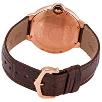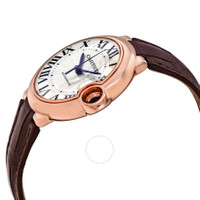 18kt rose gold case with a brown (alligator) leather strap. Fixed 18kt rose gold bezel. Silvered guilloche dial with blued-steel sword-shaped hands and black Roman numeral hour markers. Minute markers around an inner ring. Dial Type: Analog. Cartier Calibre 076 Automatic movement, based upon ETA 2670, containing 25 Jewels, bitting at 28800 vph, and has a power reserve of approximately 38 hours. Scratch resistant sapphire crystal. Pull / push cabochon-set crown. Solid case back. Round case shape, case size: 36 mm, case thickness: 12.05 mm. Band width: 16 mm. Tang clasp. Water resistant at 30 meters / 100 feet. Functions: hour, minute, second. Ballon Bleu Series. Luxury watch style. Watch label: Swiss Made. Cartier Ballon Bleu Automatic 18kt Rose Gold Ladies Watch WGBB0009. INFORMATION Brand: Cartier Series: Ballon Bleu De Cartier Collection Name: Ballon Bleu de Cartier Gender: Womens Model: WGBB0009 Watch Label: Swiss Made Movement: Automatic Engine: Cartier Calibre 076 Power Reserve: 38 hours CASE Case Size: 36 mm Case Thickness: 12.05 mm Case Material: 18kt Rose Gold Case Shape: Round Case Back: Solid BAND Band Material: (Alligator) Leather Band Type: Strap Band Color: Brown Band Width: 16 mm Clasp: Tang DIAL Dial Color: Silvered Guilloche Type: Analog Crystal: Scratch Resistant Sapphire Hands: Blued-steel Sword-shaped Dial Markers: Black Roman Numeral Second Markers: Minute Markers around an inner ring Bezel: Fixed Bezel Color: 18kt Rose Gold Bezel Material: 18kt Rose Gold Crown: Pull / Push Cabochon-set FEATURES Water Resistance: 30 meters / 100 feet Functions: Hour, Minute, Second Watch Features: Leather, Gold, Analog, Alligator Leather ADDITIONAL INFO Watch Style: Luxury Warranty: 2 Year Jomashop Warranty UPC Code: 7613268625743 Jomashop Sku: CRTWGBB0009 Department: Watches Category: Watches