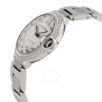 Silver-tone stainless steel case and bracelet. Fixed silver-tone stainless steel bezel set with 54 diamonds totaling 0.78 carats. Matte silvered sunray-brushed dial with blued-steel hands and diamond-Roman numeral hour markers. Roman numeral marker appears at the 12 o'clock position. Dial Type: Analog. Automatic movement. Scratch resistant sapphire crystal. Fluted crown set with a synthetic cabochon-shaped spinel. Solid case back. Round case shape, case size: 36 mm, case thickness: 12.06 mm. Water resistant at 30 meters / 100 feet. Functions: hour, minute. Ballon Bleu Series. Luxury watch style. Watch label: Swiss Made. Cartier Ballon Bleu Automatic Diamond Silver Dial Ladies Watch W4BB0036. INFORMATION Brand: Cartier Series: Ballon Bleu Collection Name: Ballon Bleu Gender: Womens Model: W4BB0036 Watch Label: Swiss Made Movement: Automatic CASE Case Size: 36 mm Case Thickness: 12.06 mm Case Material: Stainless Steel Case Shape: Round Case Back: Solid BAND Band Material: Stainless Steel Band Type: Bracelet Band Color: Silver-tone DIAL Dial Color: Silver Type: Analog Crystal: Scratch Resistant Sapphire Hands: Blued-steel Dial Markers: Diamond-Roman Numeral Second Markers: Roman Numeral Marker appears at the 12 o'clock position Bezel: Fixed Bezel Color: Silver-tone Bezel Material: Stainless Steel set with 54 diamonds totaling 0.78 carats Crown: Fluted set with a synthetic cabochon-shaped spinel FEATURES Water Resistance: 30 meters / 100 feet Functions: Hour, Minute Watch Features: Diamond, Stainless Steel, Analog ADDITIONAL INFO Watch Style: Luxury Warranty: 2 Year Jomashop Warranty Jomashop Sku: CRTW4BB0036 Department: Watches Category: Watches